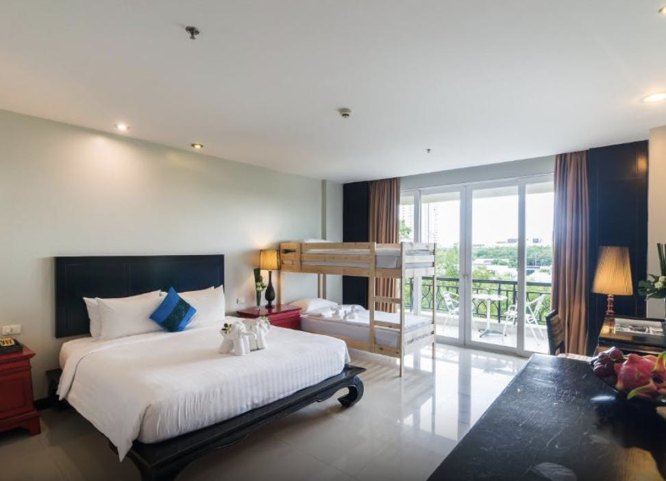 This generously sized family room features air conditioning and soundproof walls, and opens onto a terrace with views of the garden. It includes a private bathroom with a walk-in shower and is equipped with three beds.