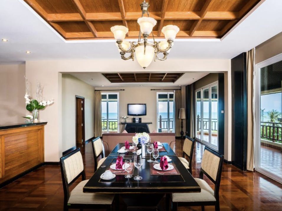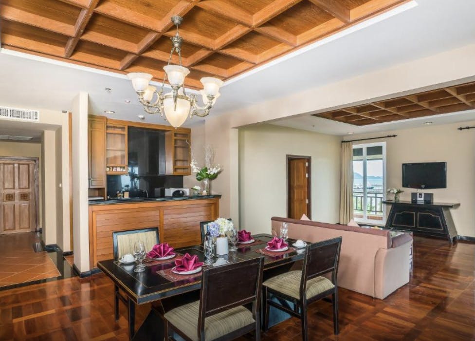 This suite offers a unique experience with its spa bath. It features a spacious layout that includes a living room, two separate bedrooms, and two bathrooms with walk-in showers and complimentary toiletries. The kitchenette, equipped with a refrigerator and microwave, allows for convenient cooking and food storage. Additional amenities include air conditioning, soundproof walls, a minibar, a tea and coffee maker, and a flat-screen TV with cable channels. Guests can also enjoy stunning sea views. The suite is furnished with three beds.